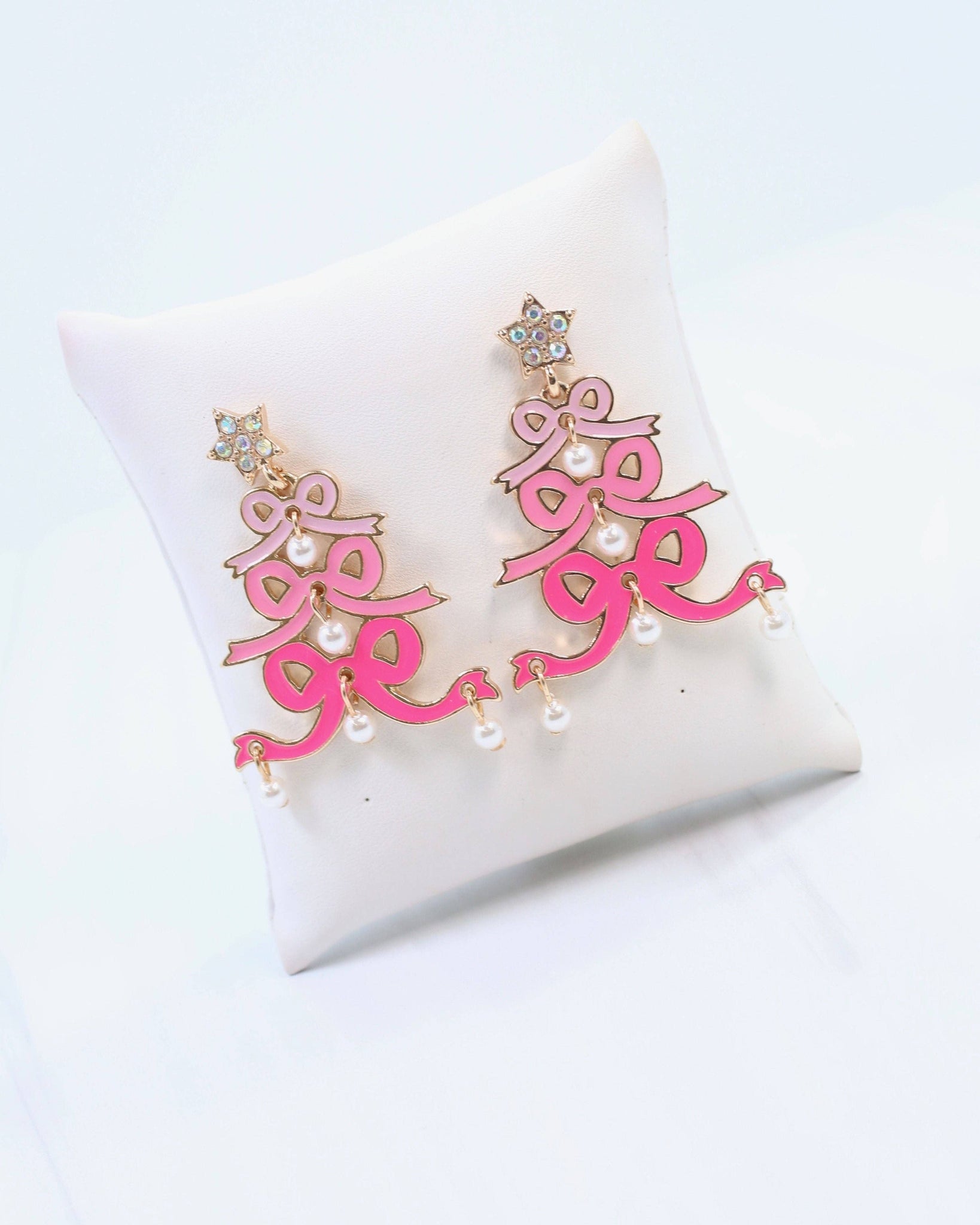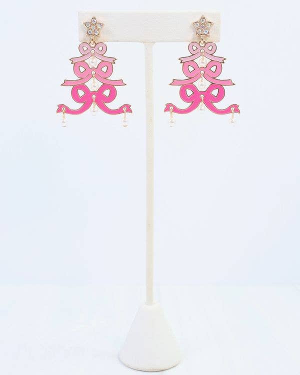 Celebrate the holiday season with the Cheerful Bow Tree Earring in pink. This elegant design features a stacked tree of graduated pink enamel bows accented with pearl dangles on each tier and an iridescent stone star post. Combining sophistication and festive fun, it's a stylish statement for any festive occasion. Dimensions: * 1.8" Length * 1.4" Width